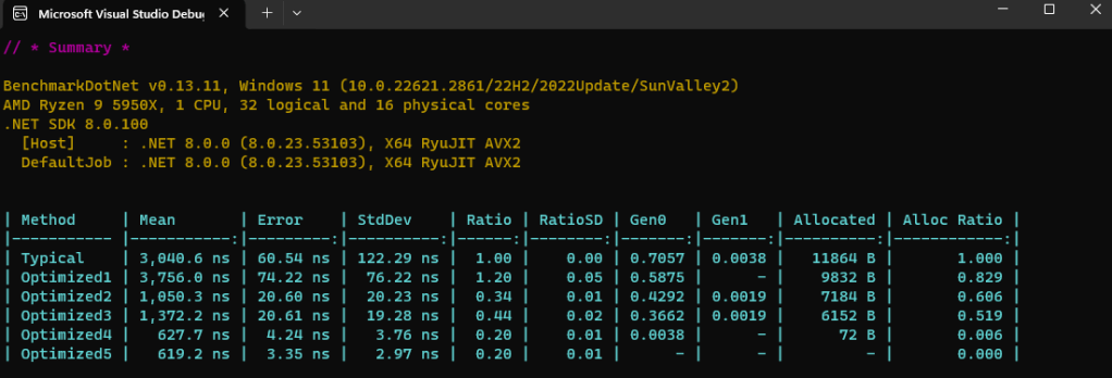 We have eliminated all 13 memory allocations! The code is now allocation-free, except for the case where output.WriteAsync() must complete asynchronously (in which case allocating a state machine box is unavoidable).