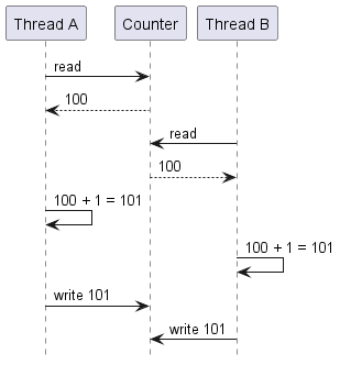 Alternatively, a thread might load the value N, then be suspended by the operating system, then after the other thread has done 5000 increments to reach N+5000, then the original thread resumes executing and writes N+1, erasing 5000 increments made by the other thread.