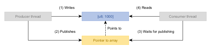 0x01into each byte. In other words, it creates the equivalent of a[1_u8; 1000]. - Once the array has been created and filled, Producer publishes a pointer to this array via a shared variable (which contains a null pointer until the array gets published).
