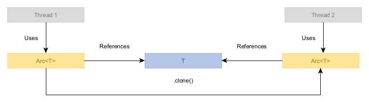T, shared between all clones of theArc. - A shared reference count, indicating how many clones exist. When this becomes zero, the value is dropped.